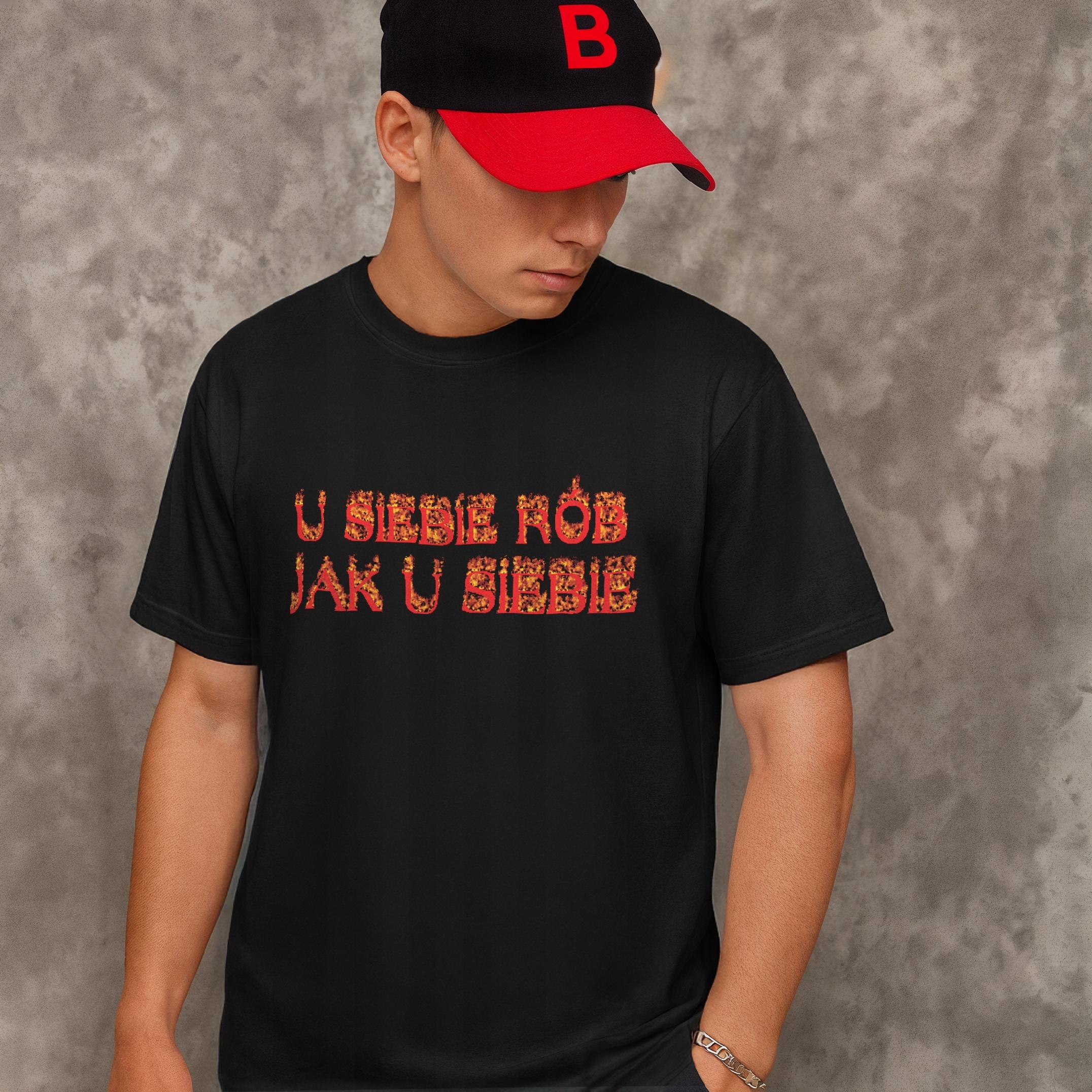 ✨ Czarna koszulka męska z zabawnym tekstem z polskiego internetu – idealny prezent dla każdego fana polskich memów! ✨