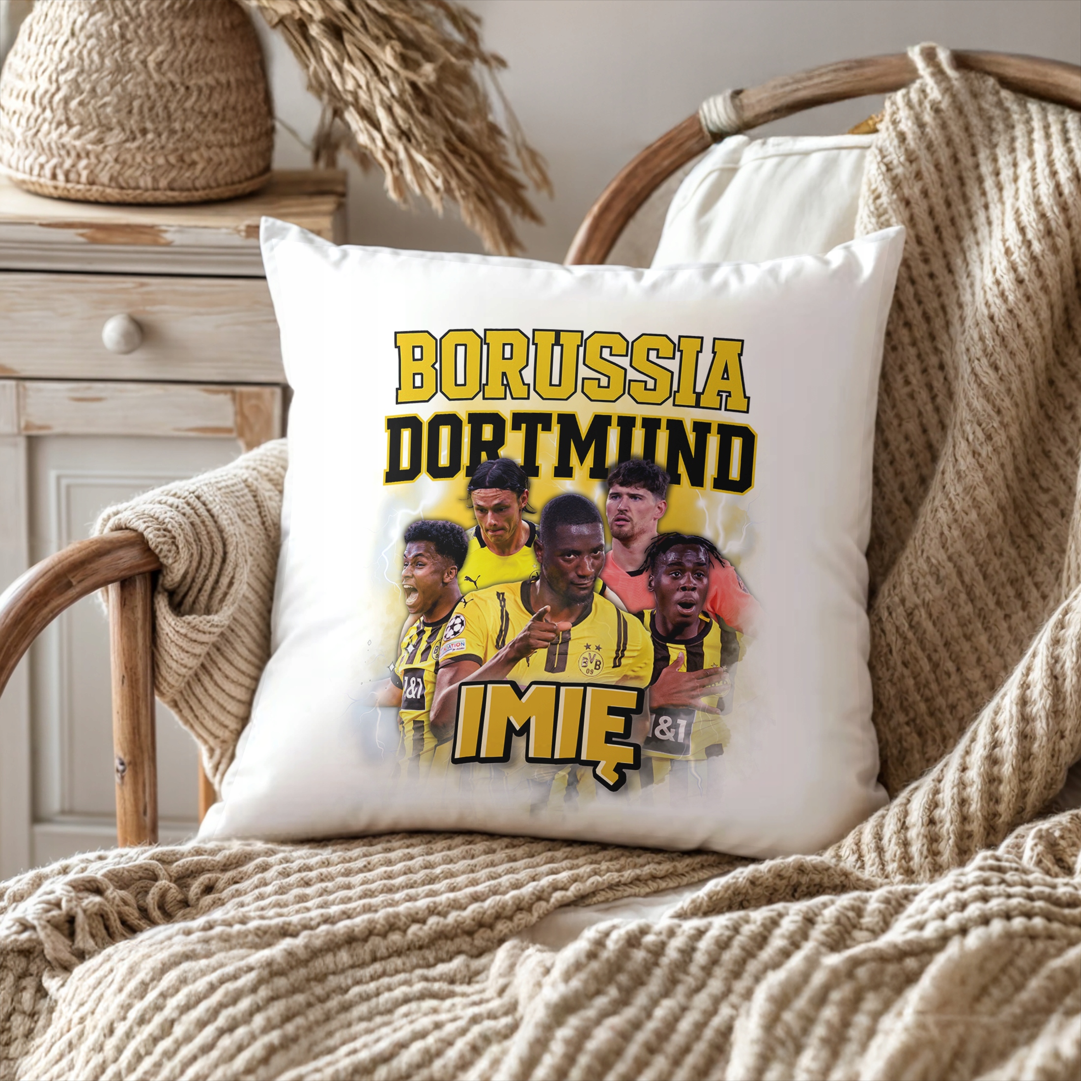 ✨ Personalizowana poduszka z imieniem 38×38 cm dla kibiców Borussii Dortmund – Idealny prezent dla fanów, którzy kochają piłkarskie emocje! ✨