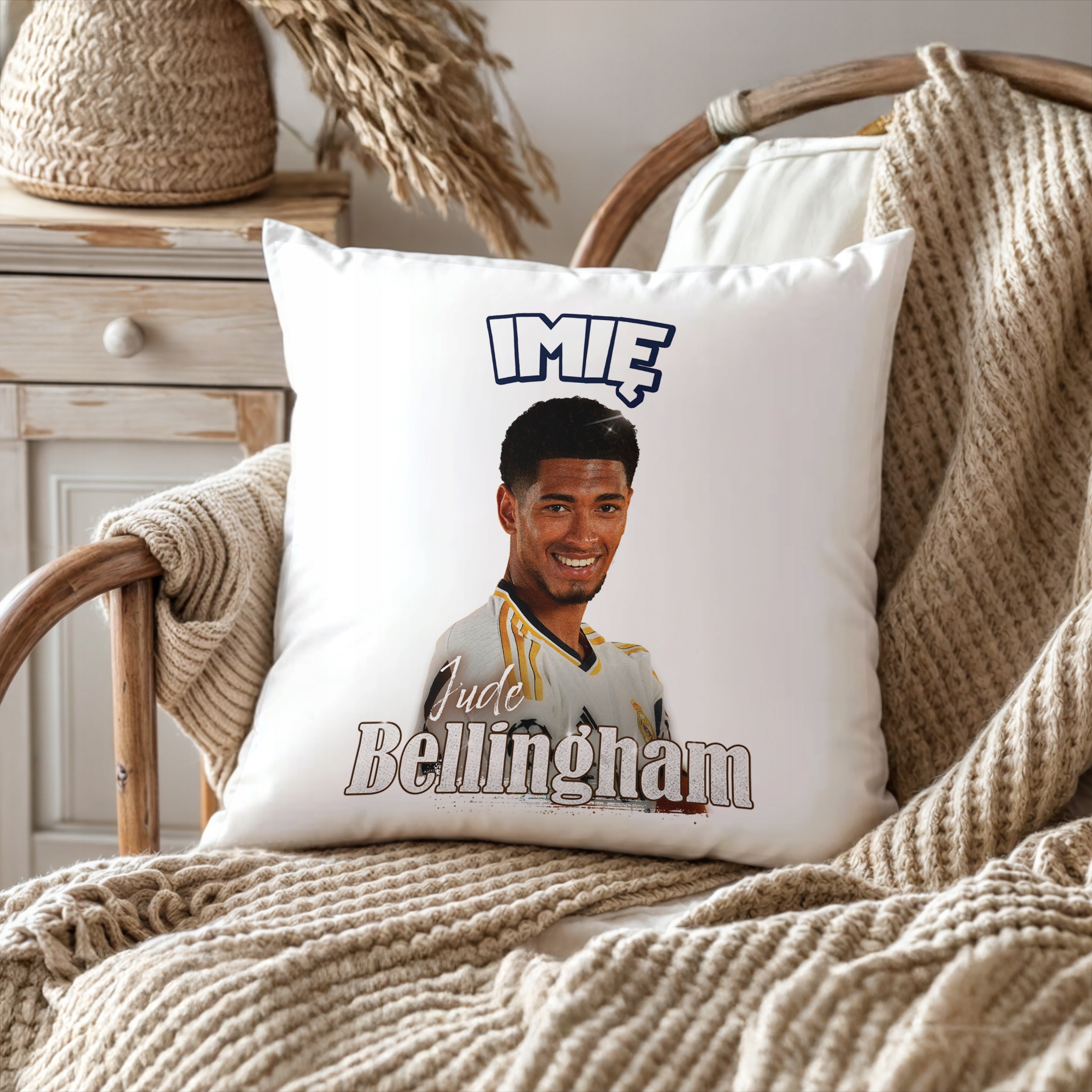 ✨ Personalizowana poduszka z imieniem 38×38 cm dla kibiców Realu Madryt – Idealny prezent dla fanów Jude’a Bellinghama, którzy kochają piłkarskie emocje! ✨