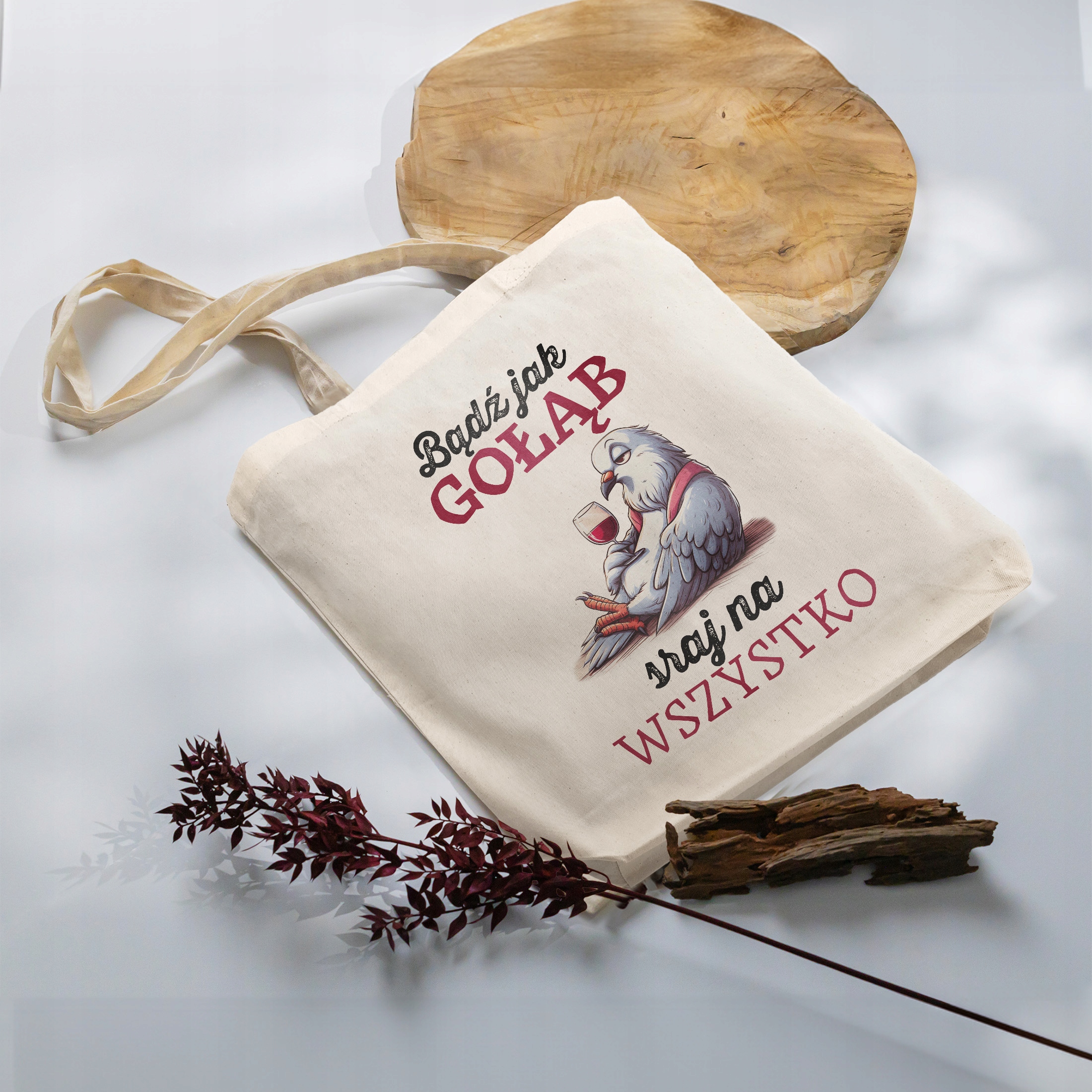 ✨ Torba bawełniana z dnem z zabawnym napisem ,,Bądź jak gołąb – Sraj na wszystko” ✨