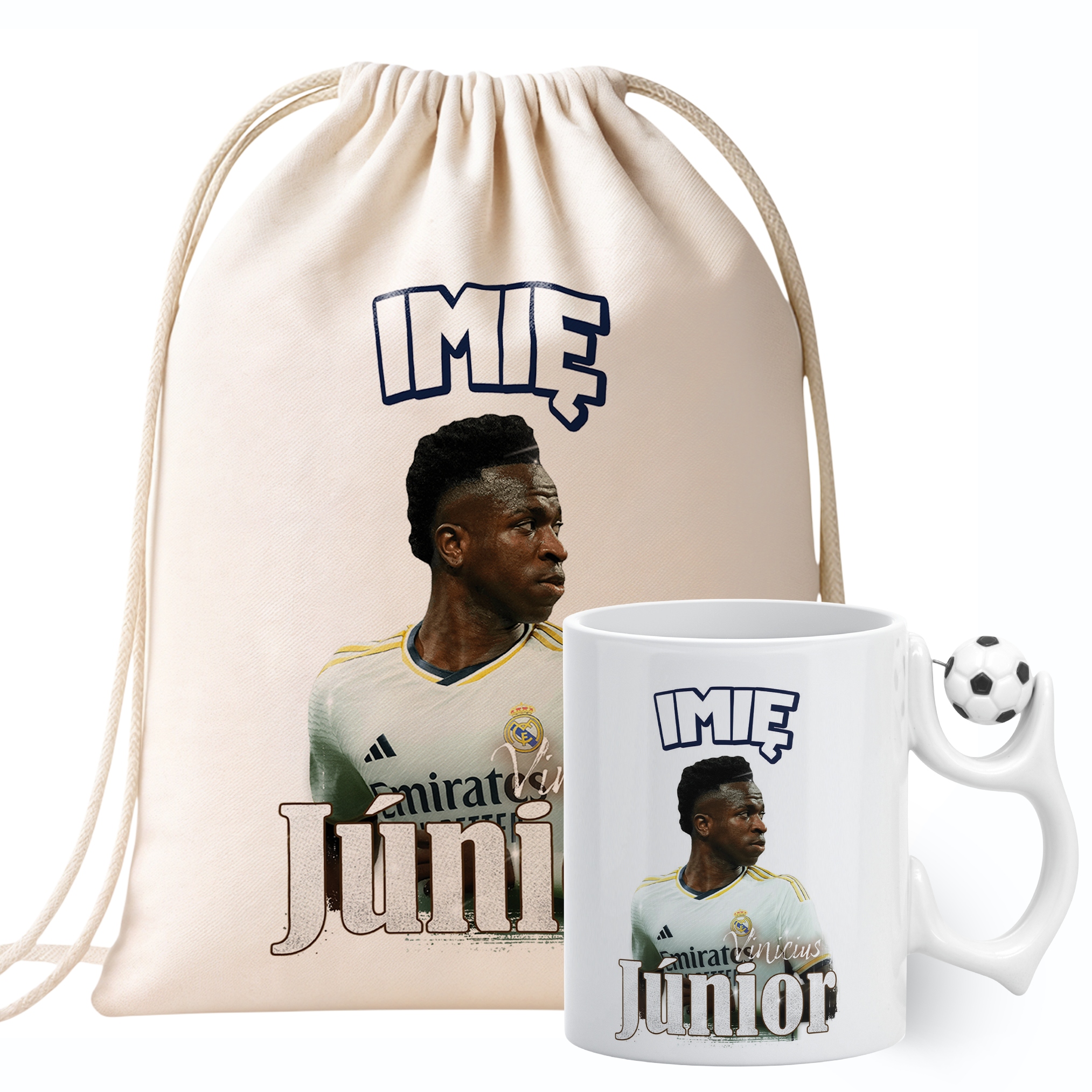 ✨ Zestaw prezentowy z imieniem plecak bawełniany i kubek piłkarski dla kibiców Realu Madryt – Idealny prezent dla fanów Viniciusa Juniora, którzy kochają piłkarskie emocje! ✨