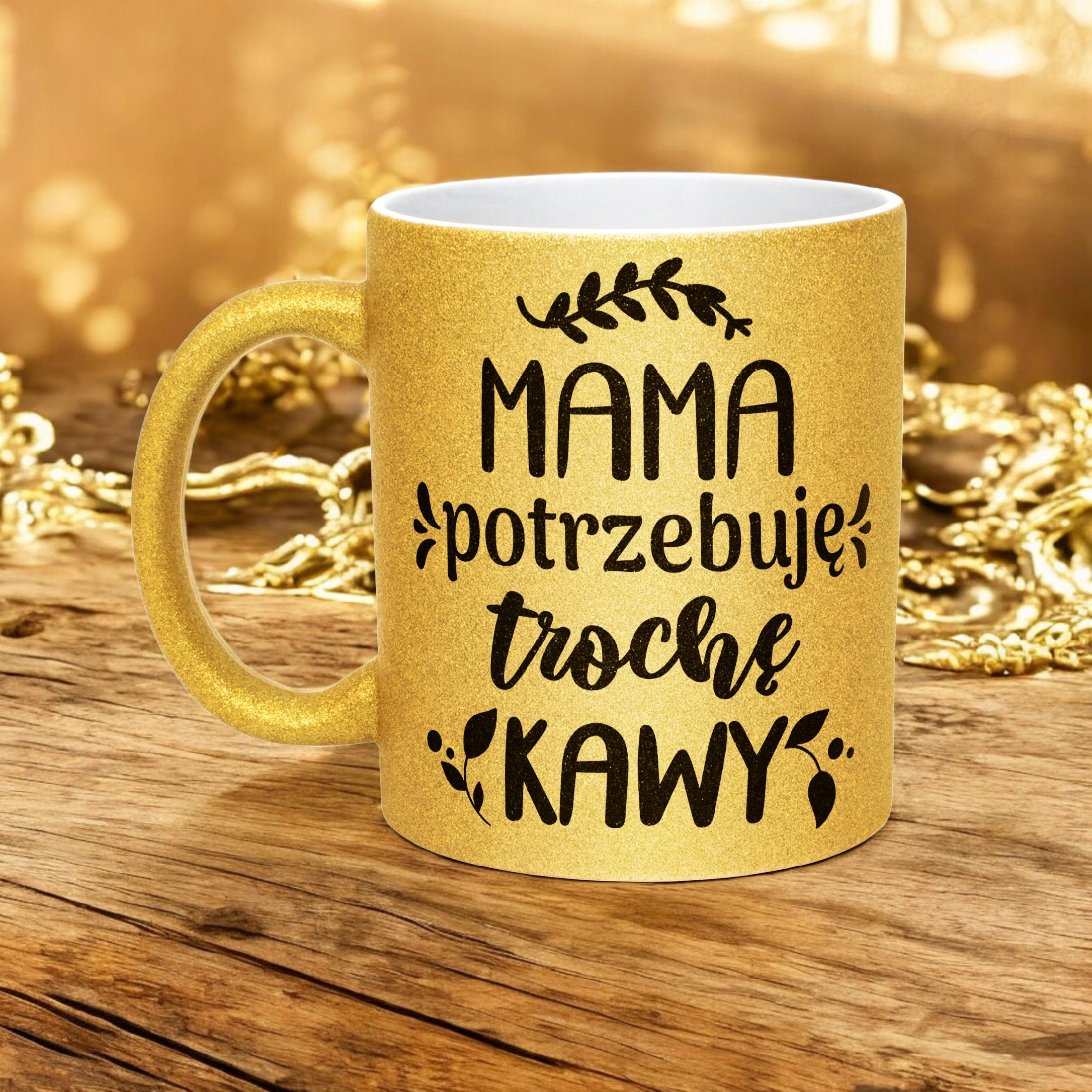 Złoty kubek brokatowy Dzień Matki Dla Mamy Mama Potrzebuję Trochę Kawy