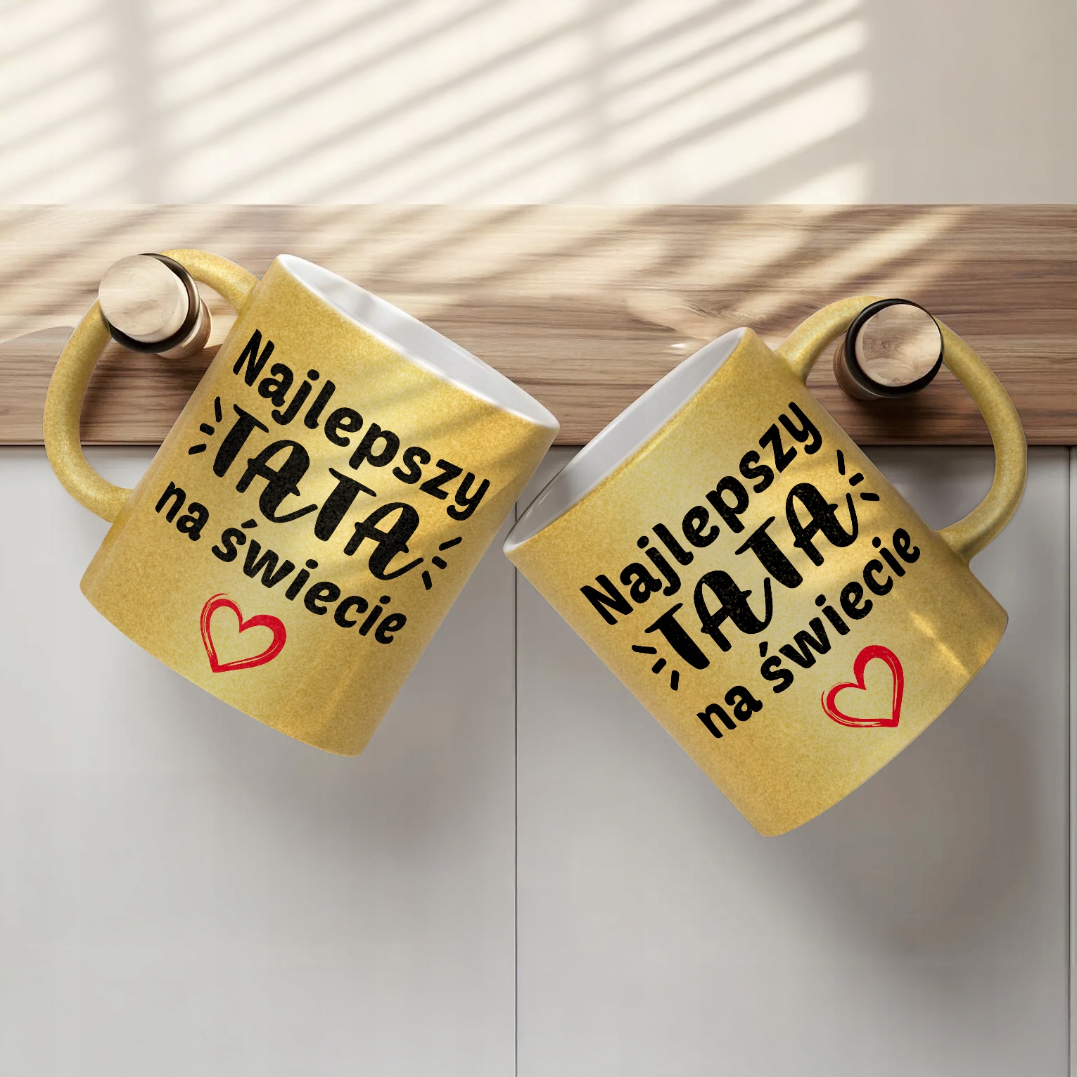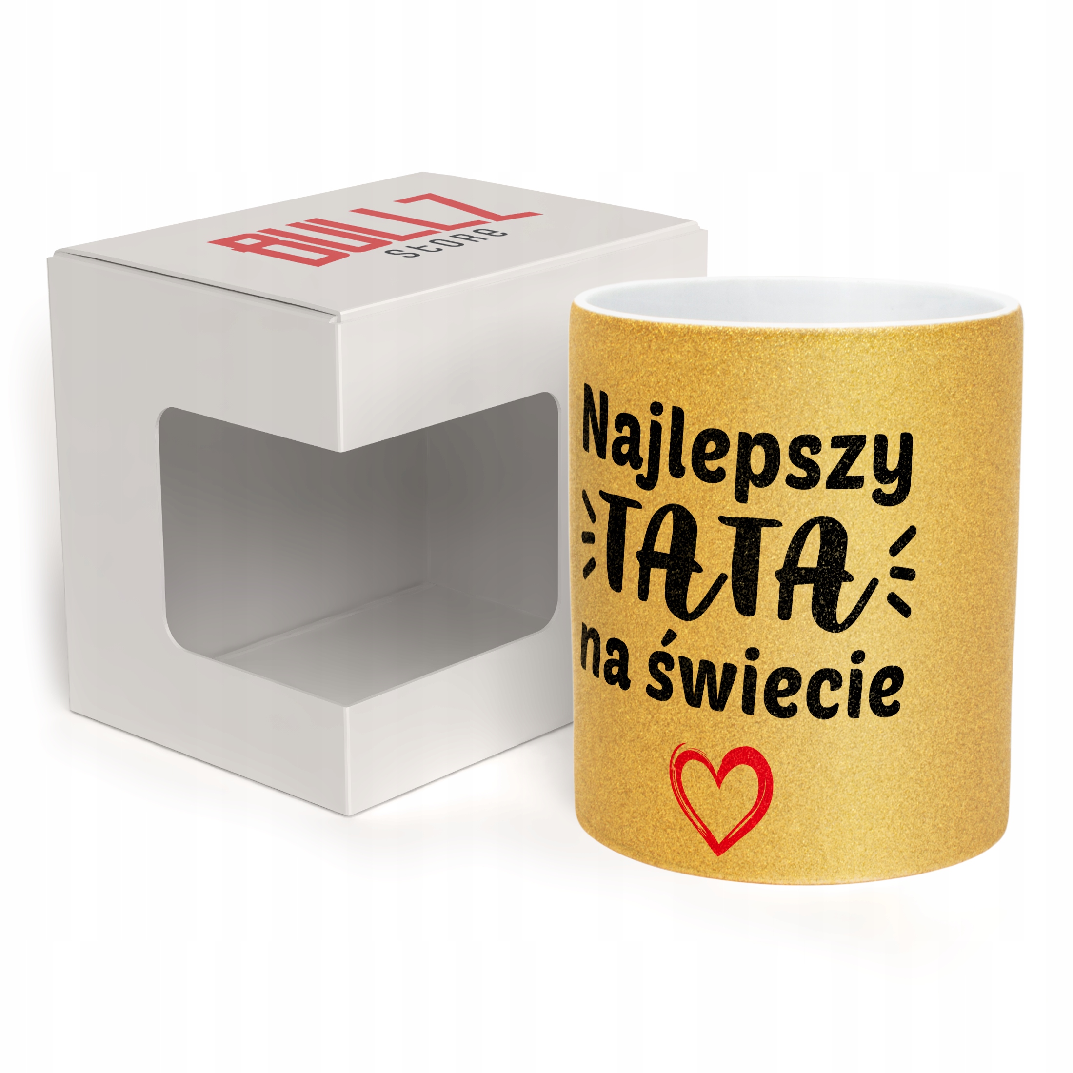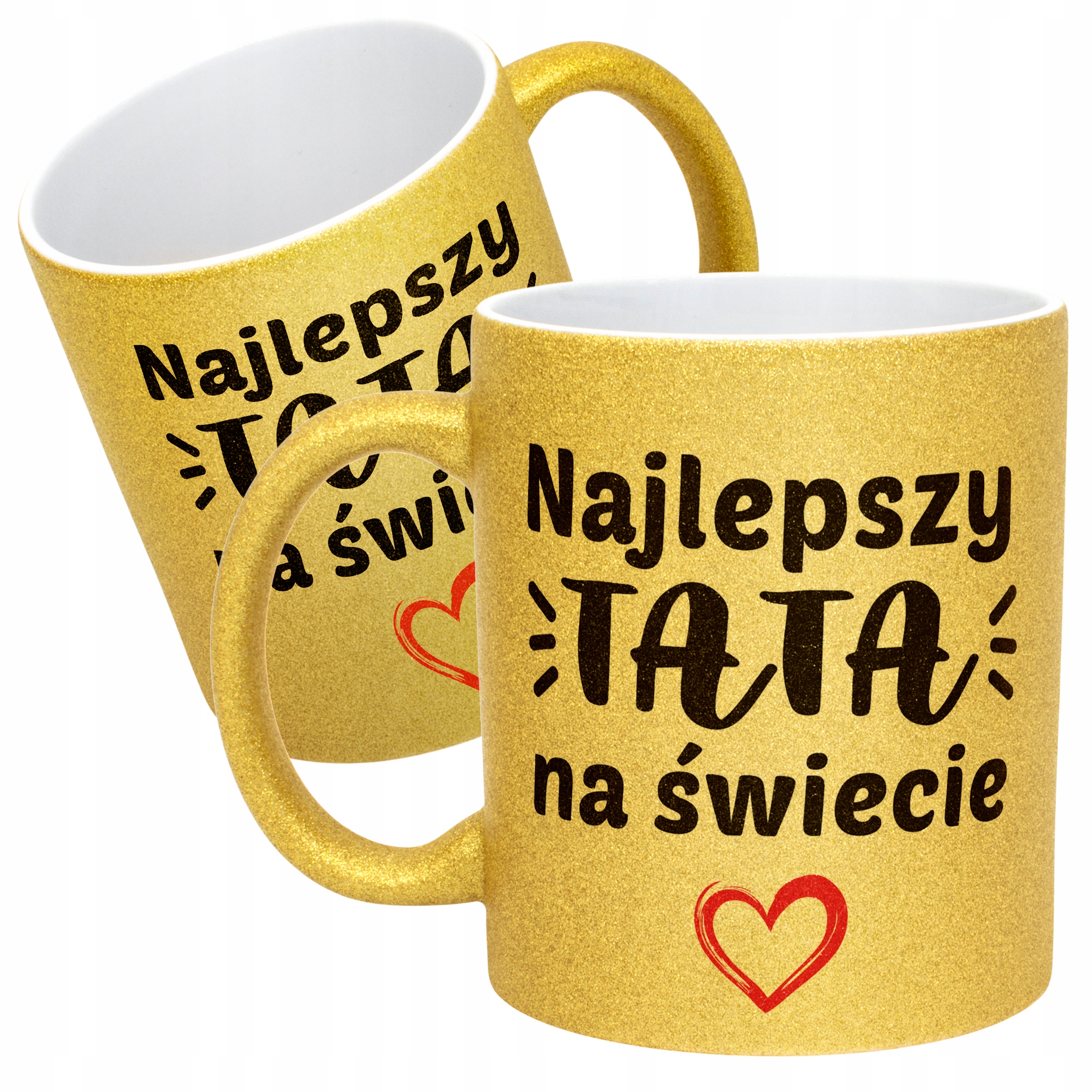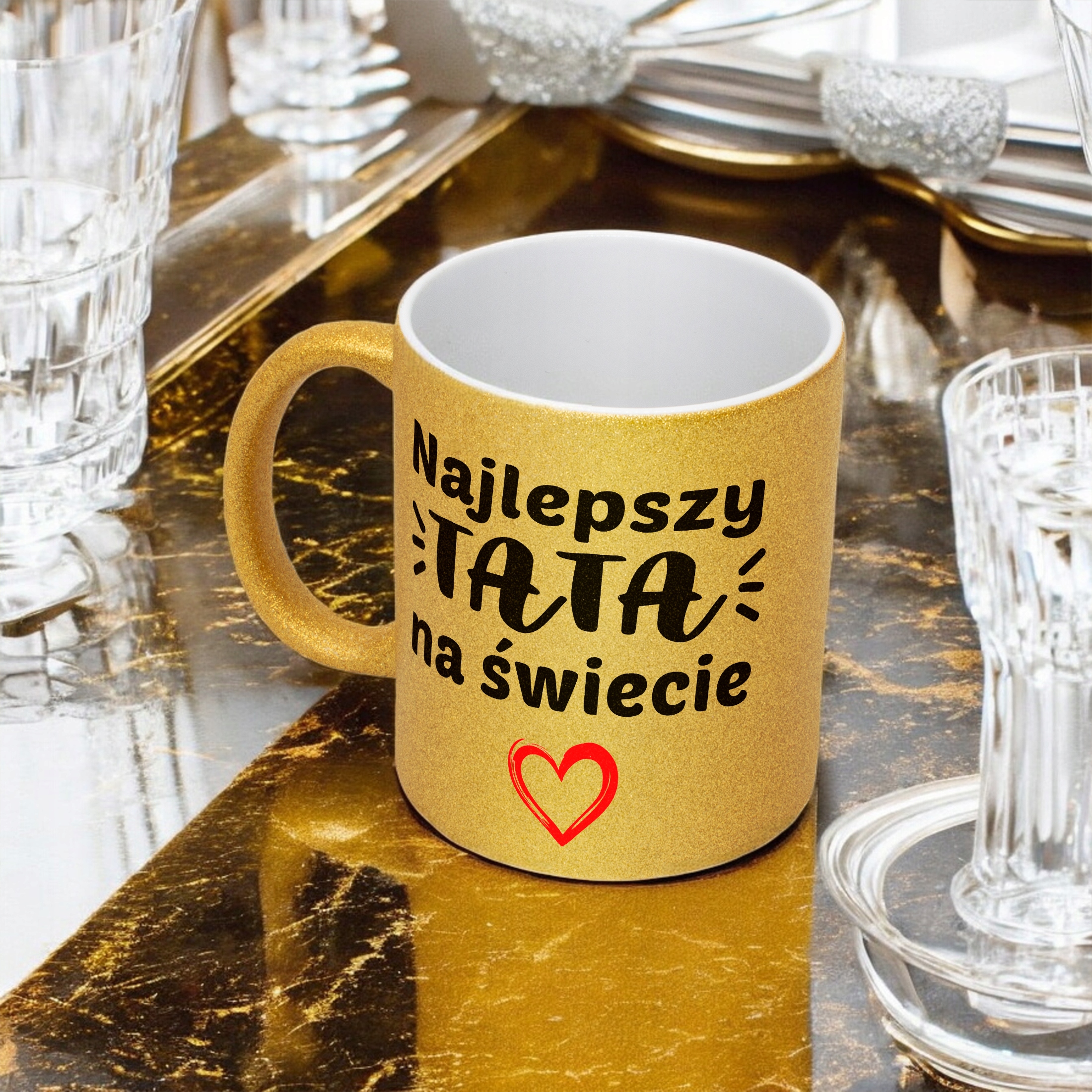 - Pełna powierzchnia brokatu: efektowny złoty połysk przyciąga wzrok i nadaje kubkowi luksusowego charakteru. Wnętrze kubka pozostaje białe, co dodaje mu elegancji i kontrastu.
