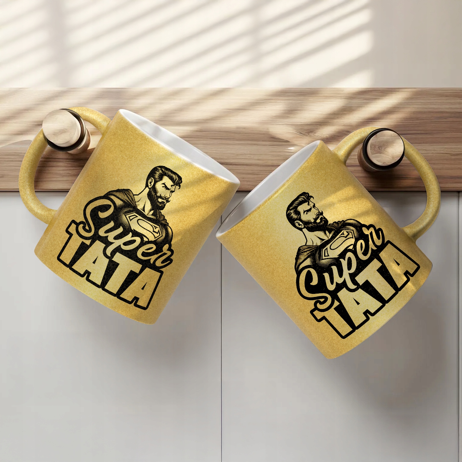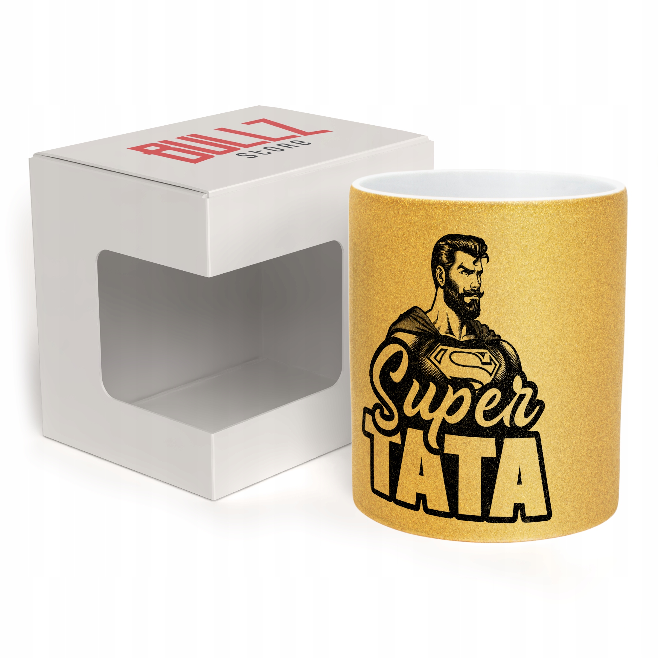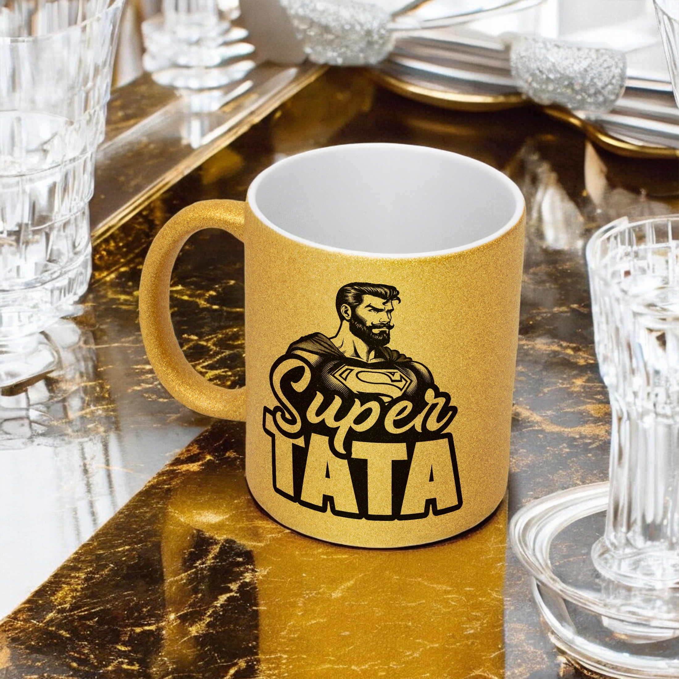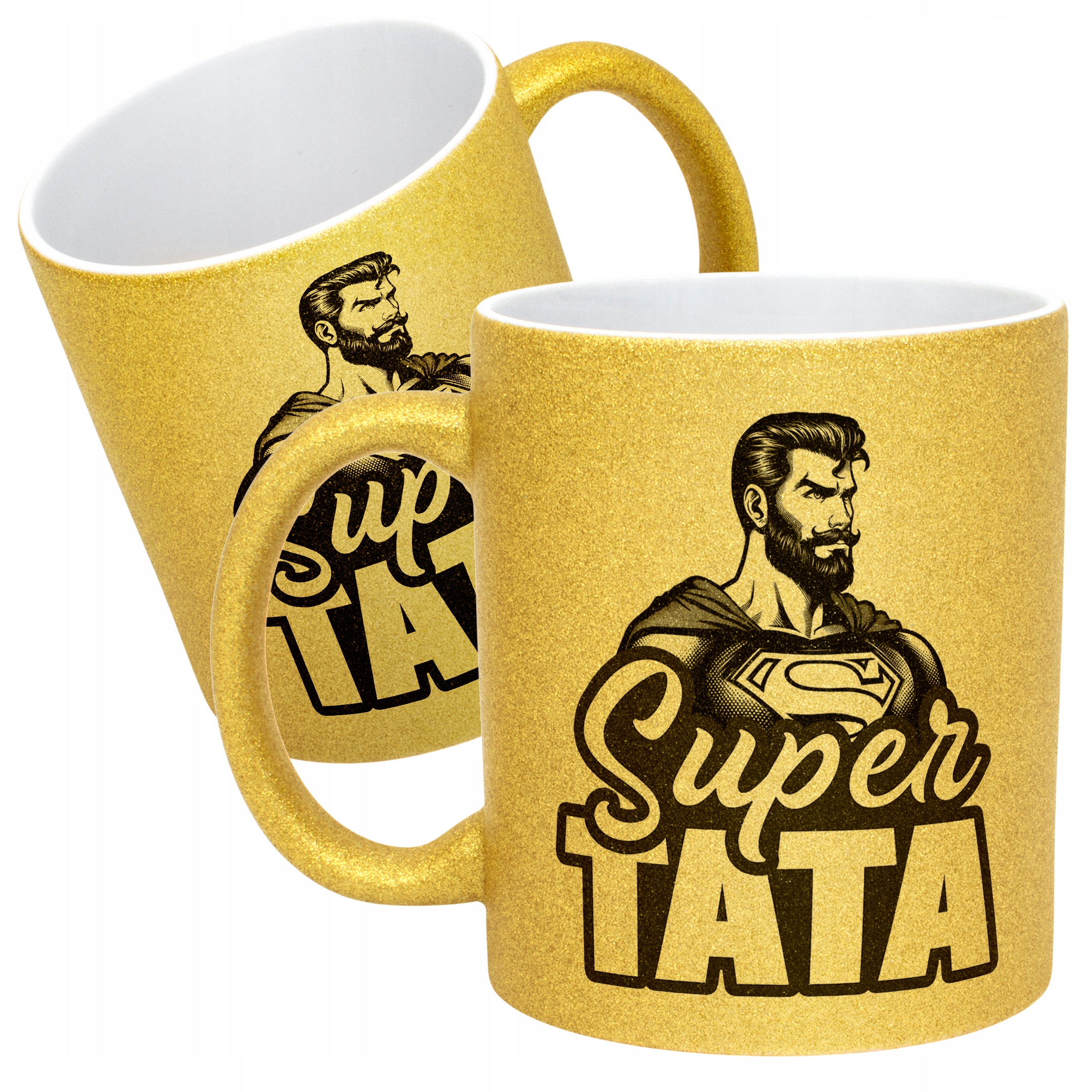 - Pełna powierzchnia brokatu: efektowny złoty połysk przyciąga wzrok i nadaje kubkowi luksusowego charakteru. Wnętrze kubka pozostaje białe, co dodaje mu elegancji i kontrastu.