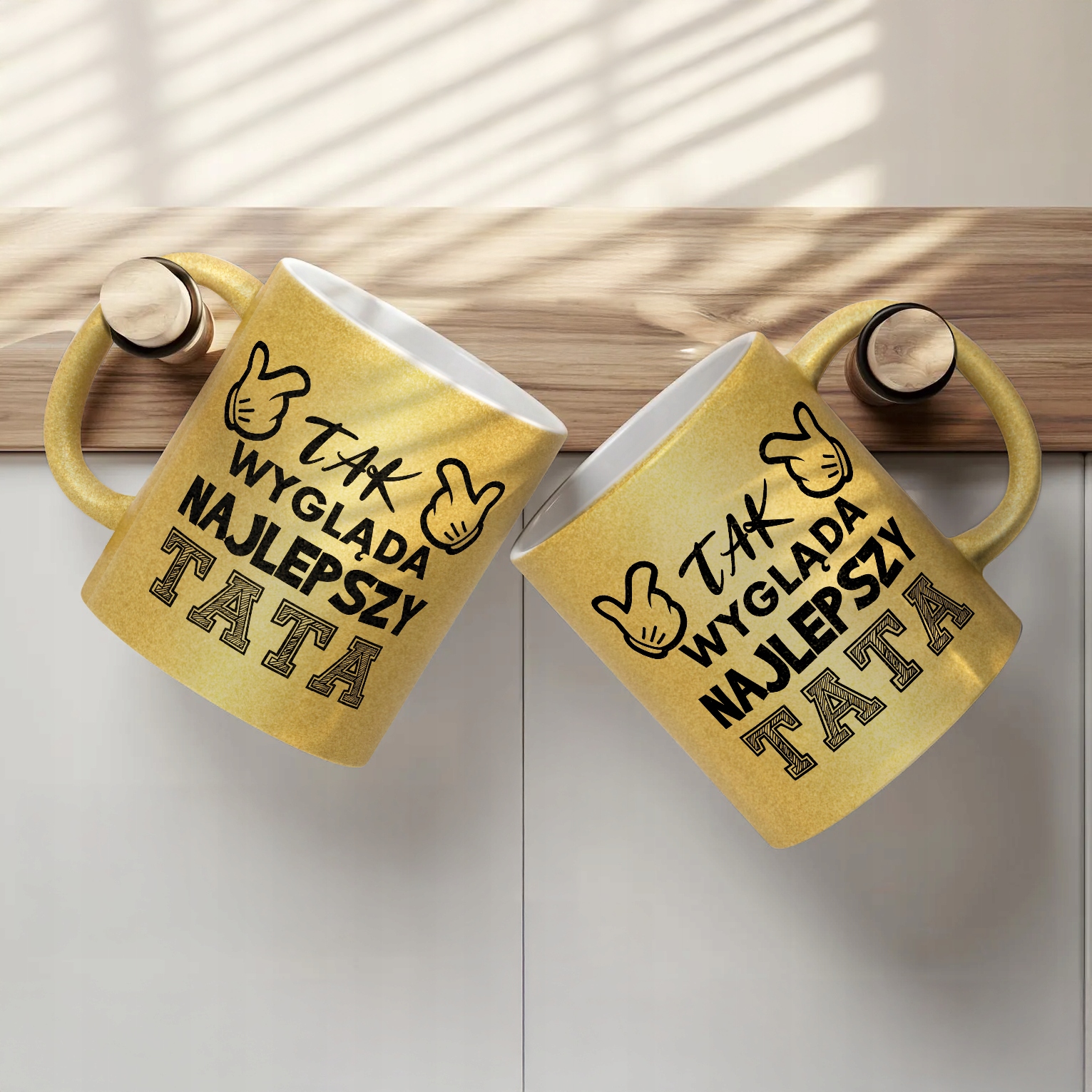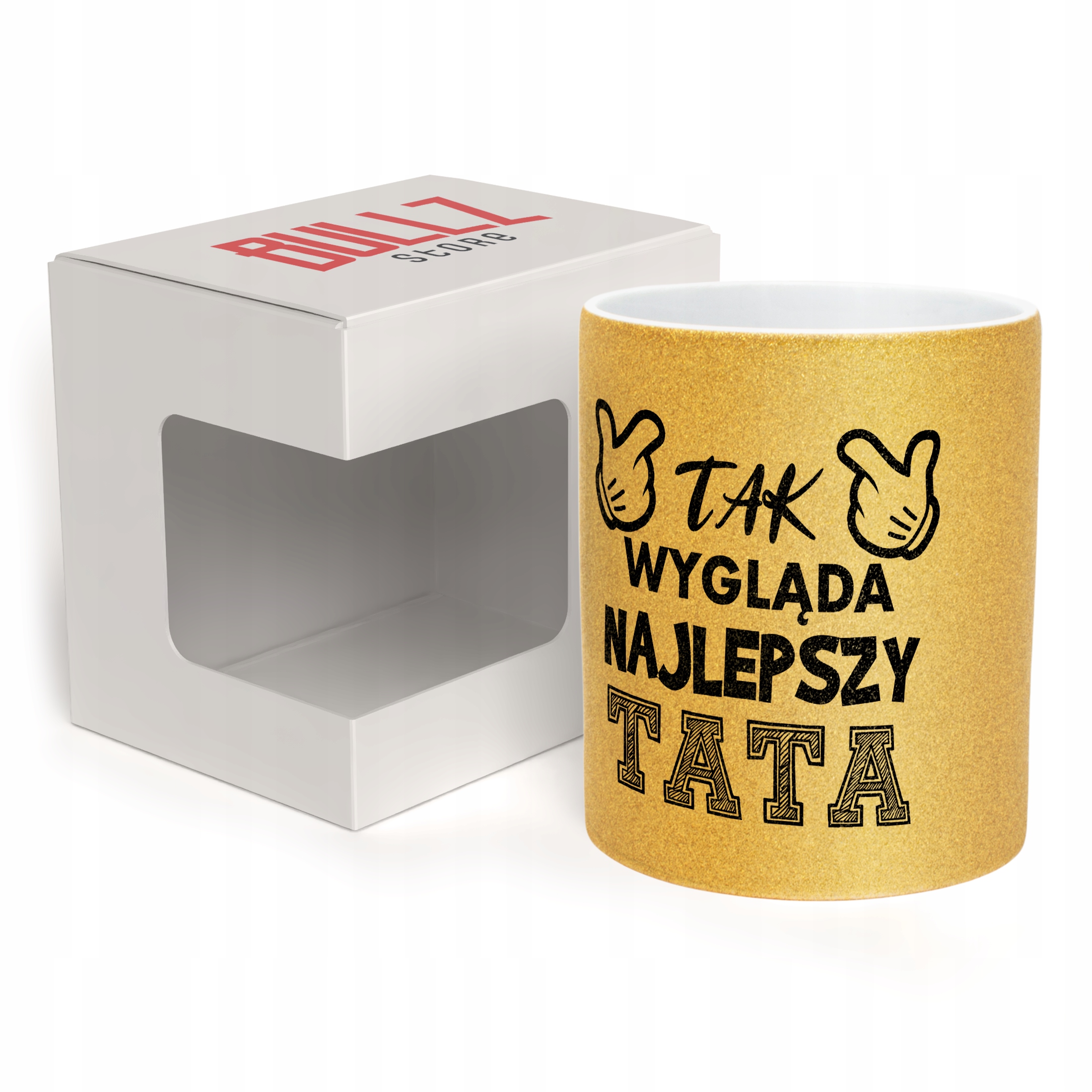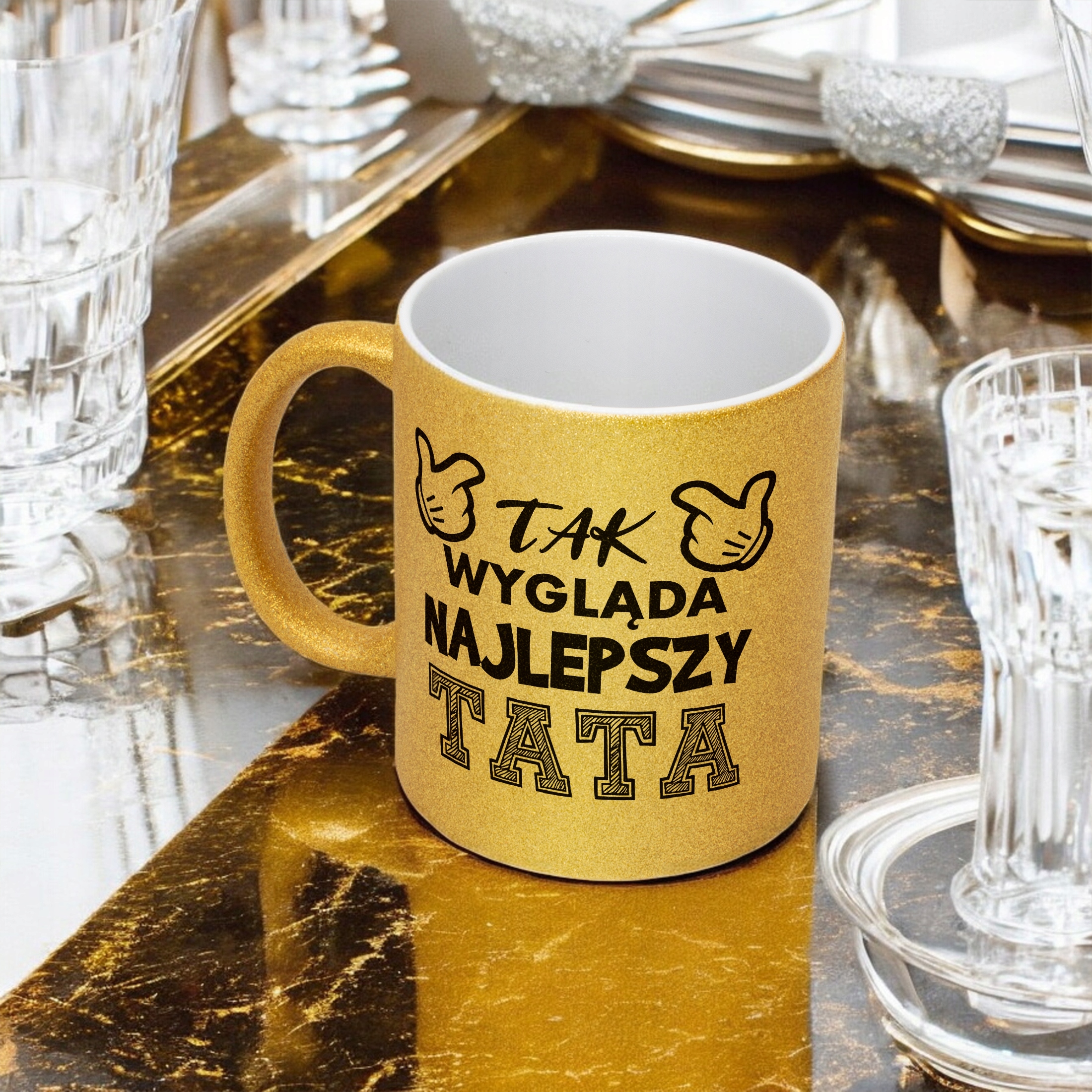 - Pełna powierzchnia brokatu: efektowny złoty połysk przyciąga wzrok i nadaje kubkowi luksusowego charakteru. Wnętrze kubka pozostaje białe, co dodaje mu elegancji i kontrastu.