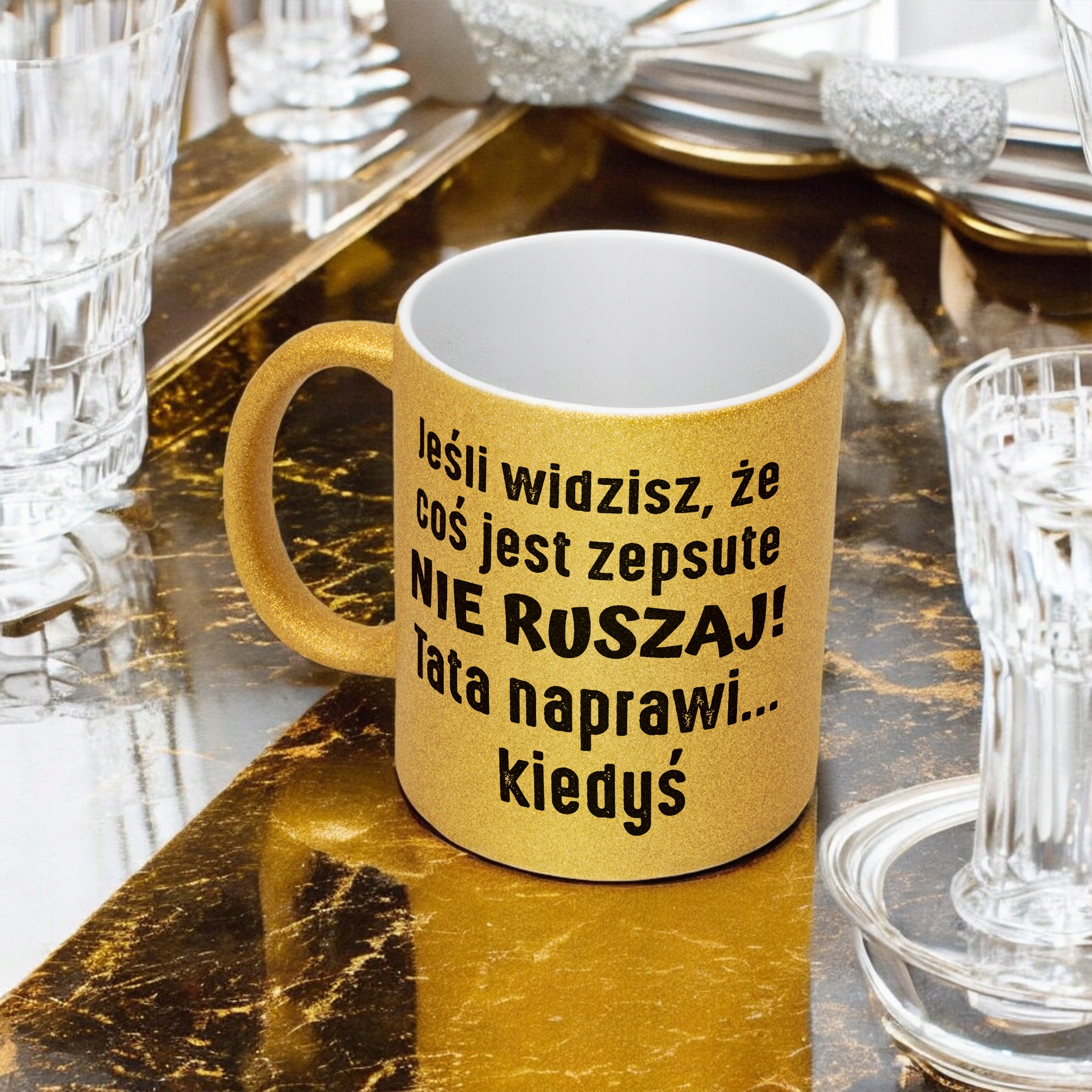 - Pełna powierzchnia brokatu: efektowny złoty połysk przyciąga wzrok i nadaje kubkowi luksusowego charakteru. Wnętrze kubka pozostaje białe, co dodaje mu elegancji i kontrastu.