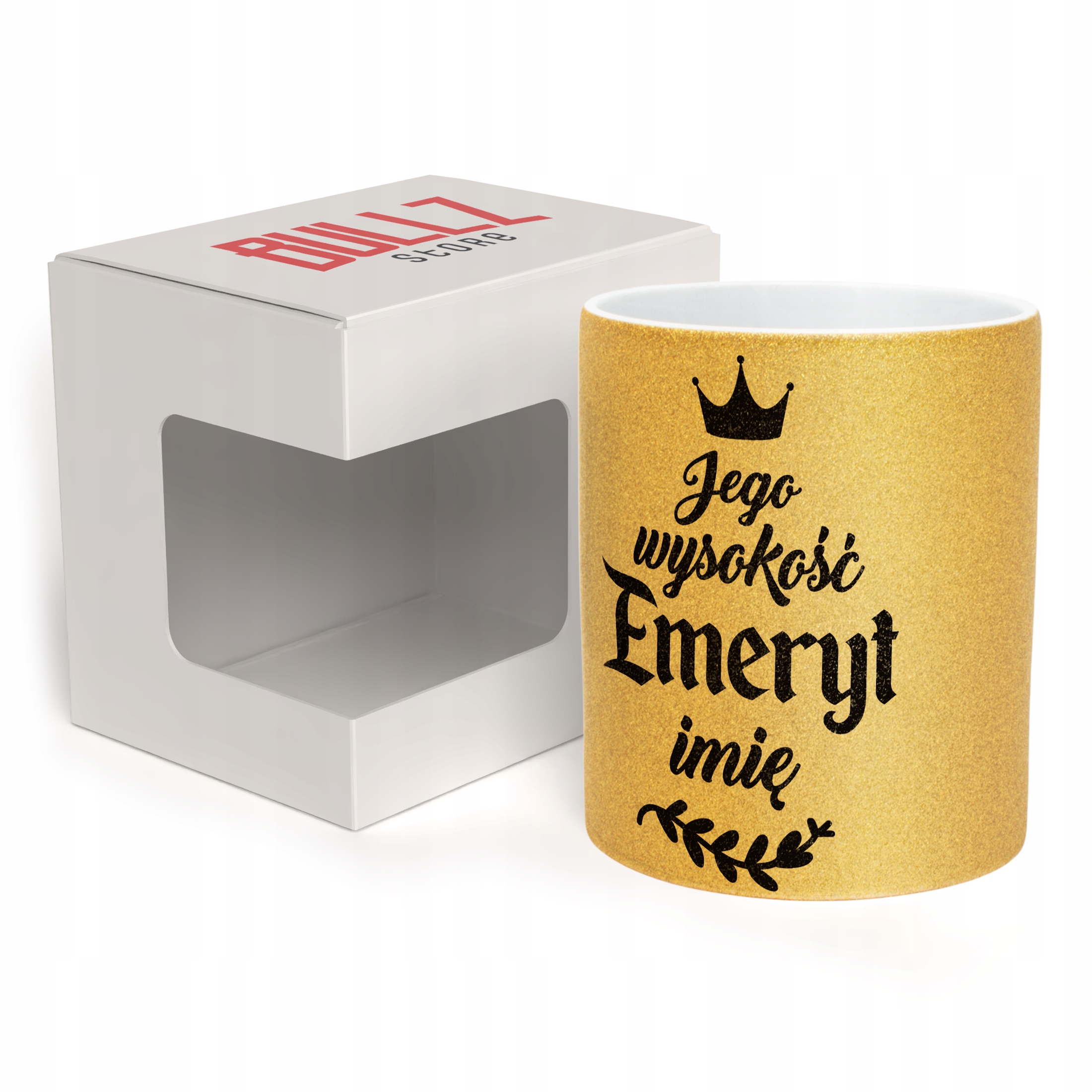 - Pełna powierzchnia brokatu: efektowny złoty połysk przyciąga wzrok i nadaje kubkowi luksusowego charakteru. Wnętrze kubka pozostaje białe, co dodaje mu elegancji i kontrastu.