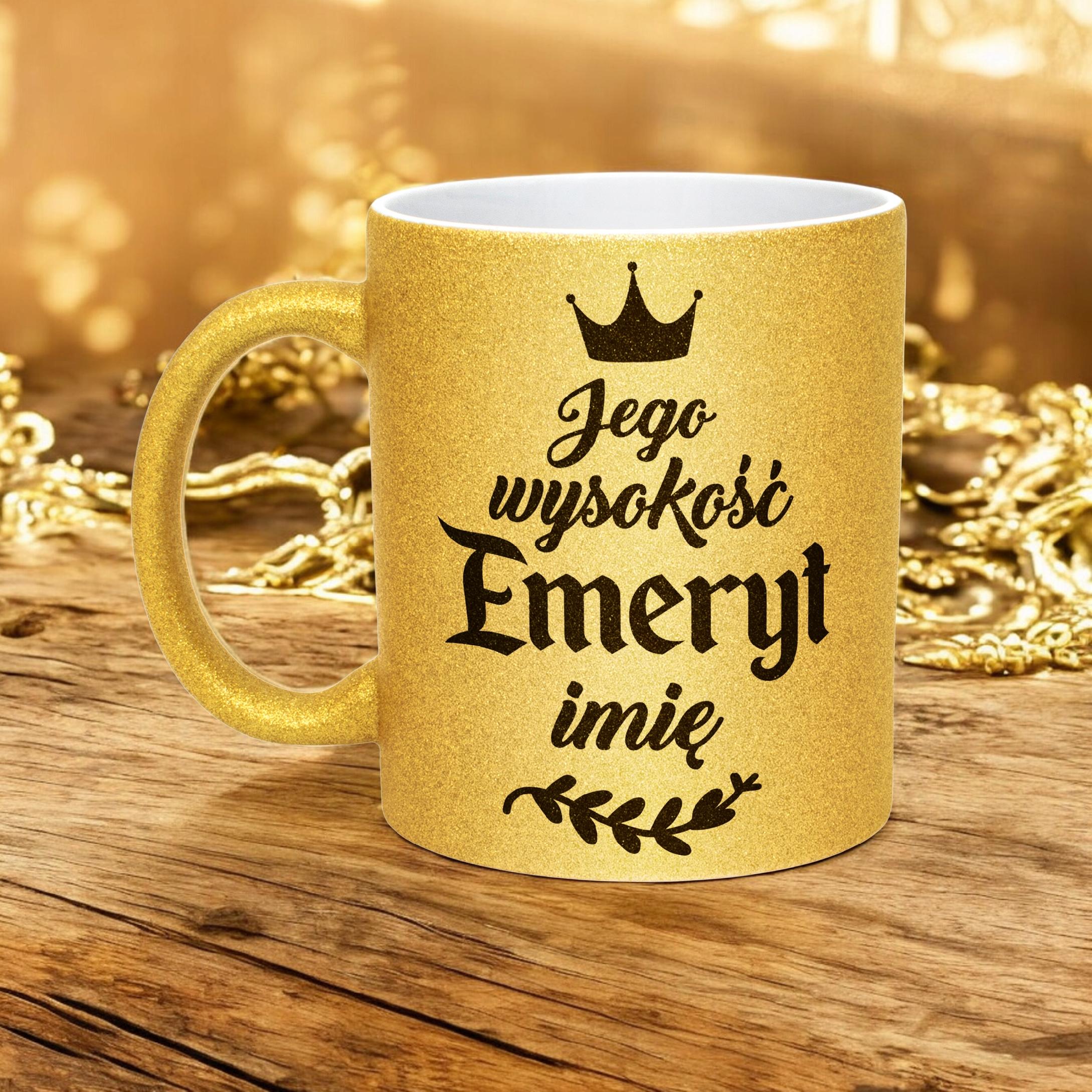 Złoty kubek brokatowy personalizowany Emerytura Dla Emeryta Prezent