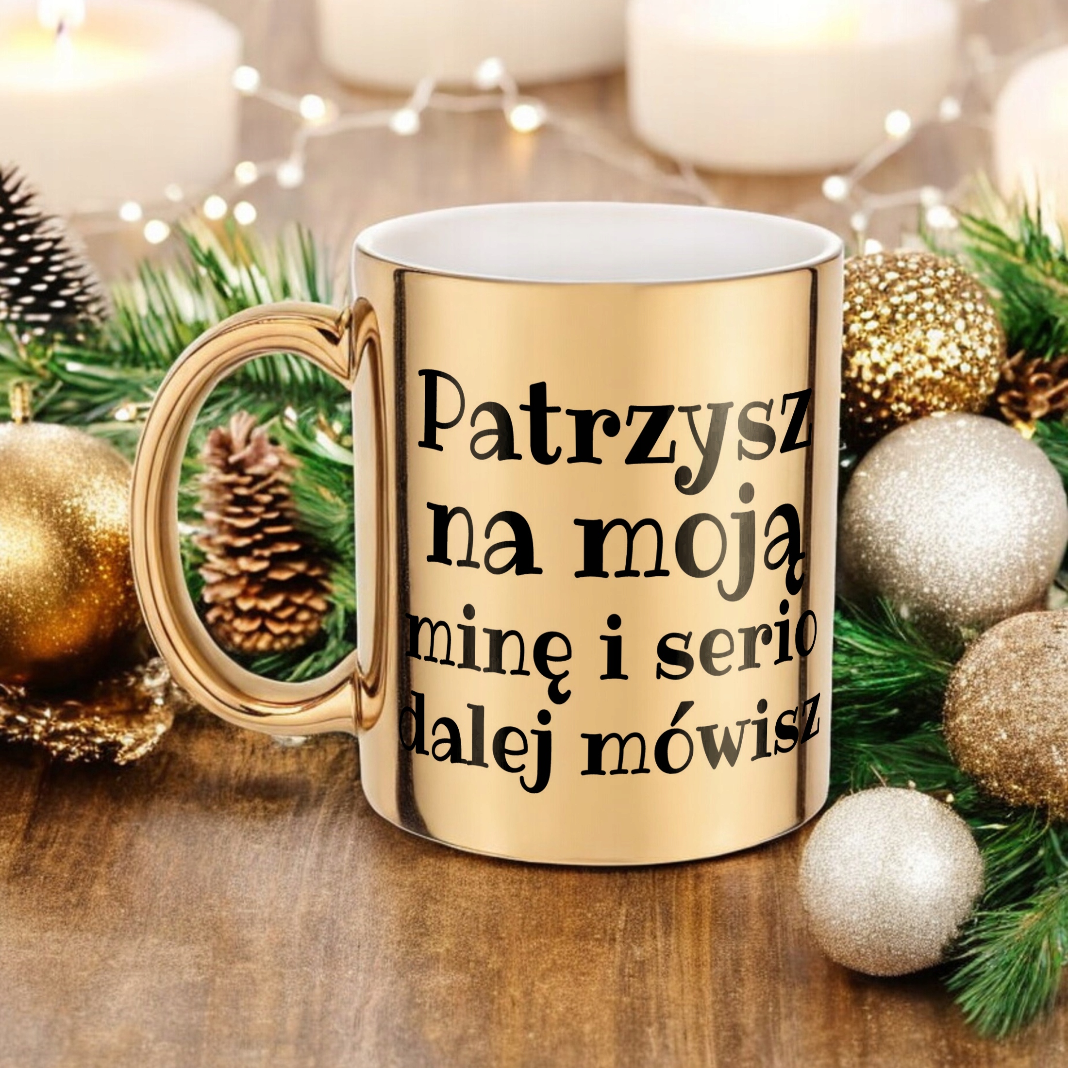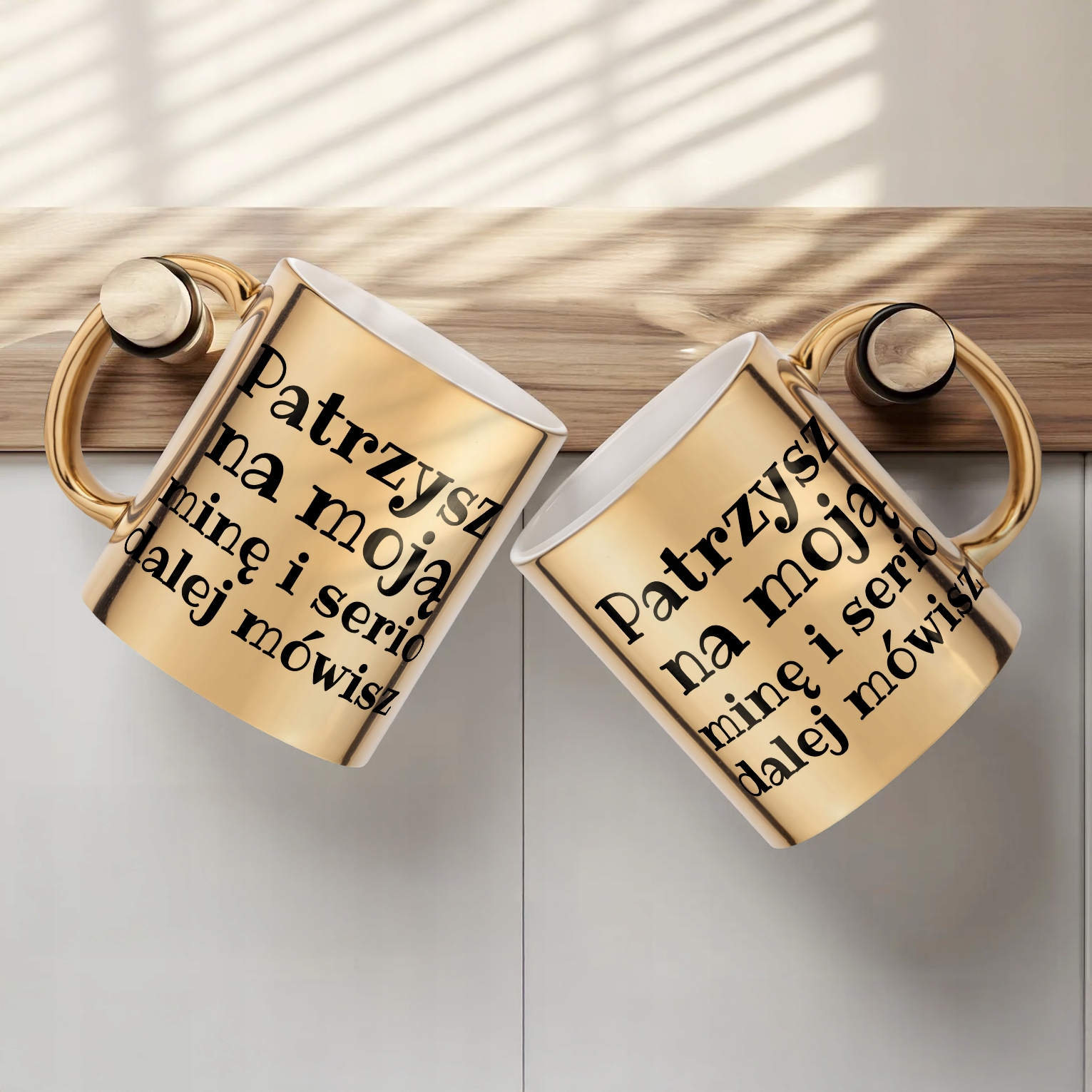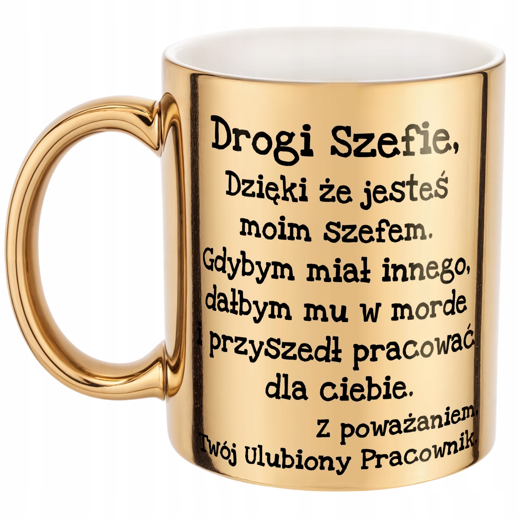 ✨ Złoty kubek ceramiczny 330 ml z sarkastycznym napisem – Idealny upominek z nutką sarkazmu. ✨
