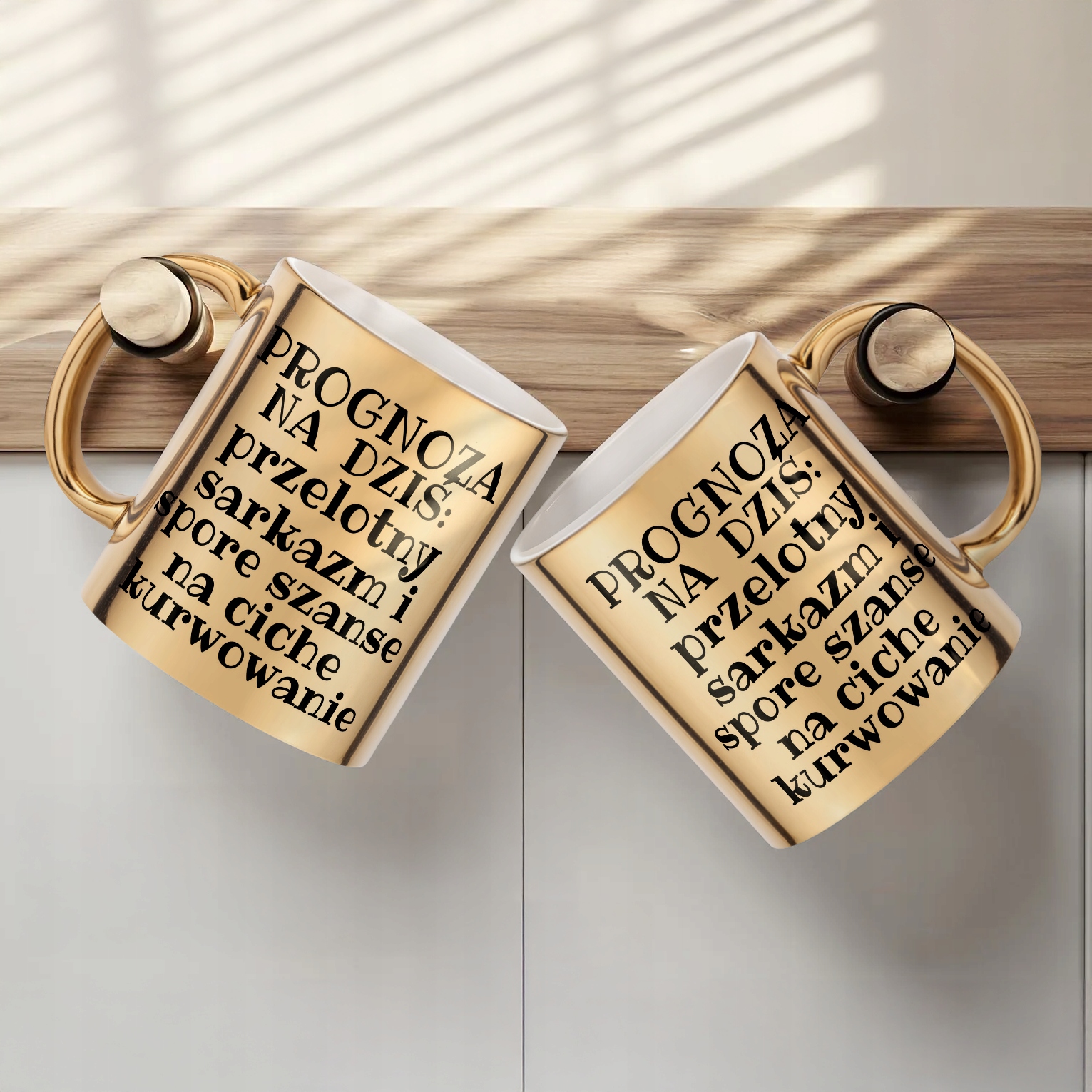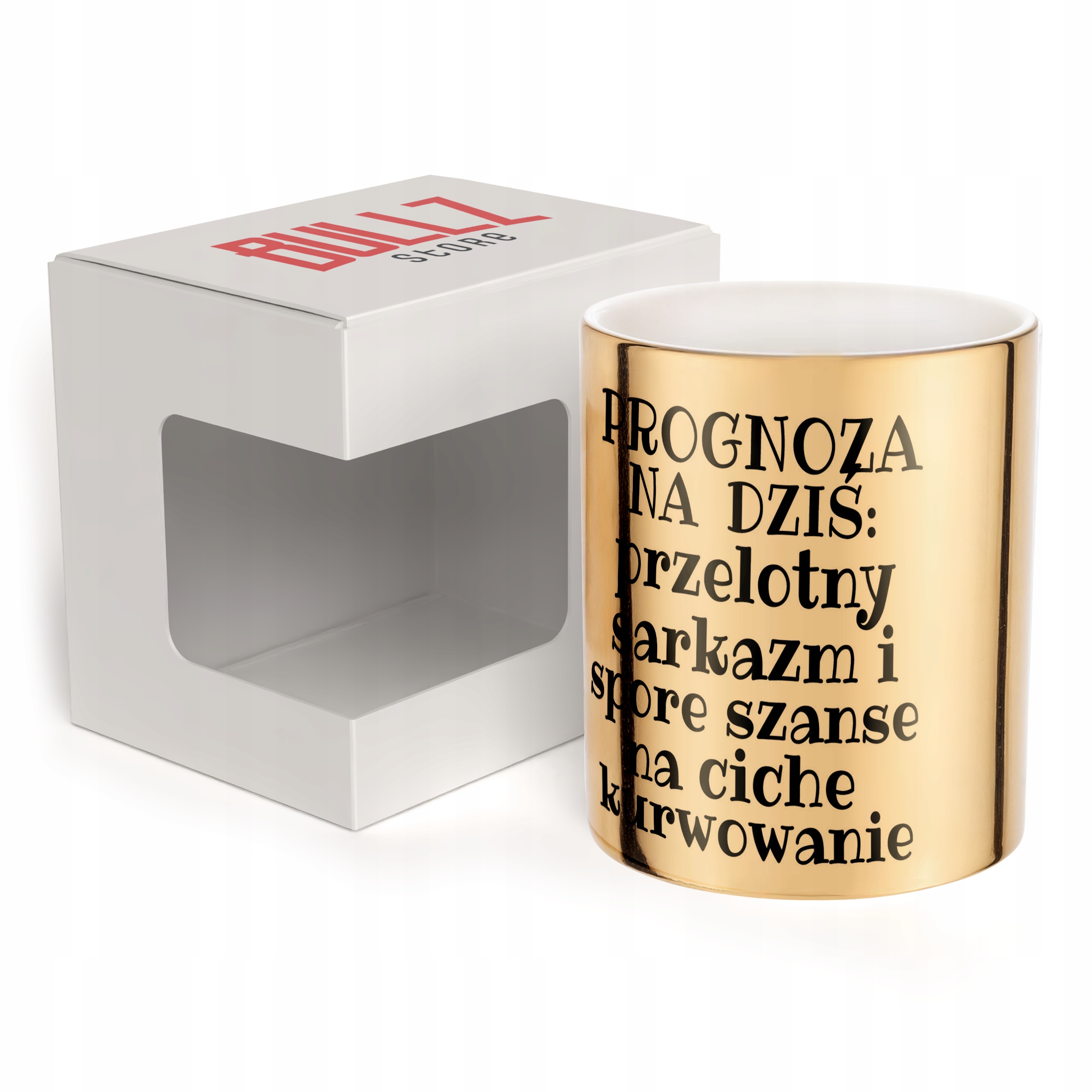 ✨ Złoty kubek ceramiczny 330 ml z codzienną prognozą humoru – Idealny upominek dla fanów sarkazmu i kawy. ✨